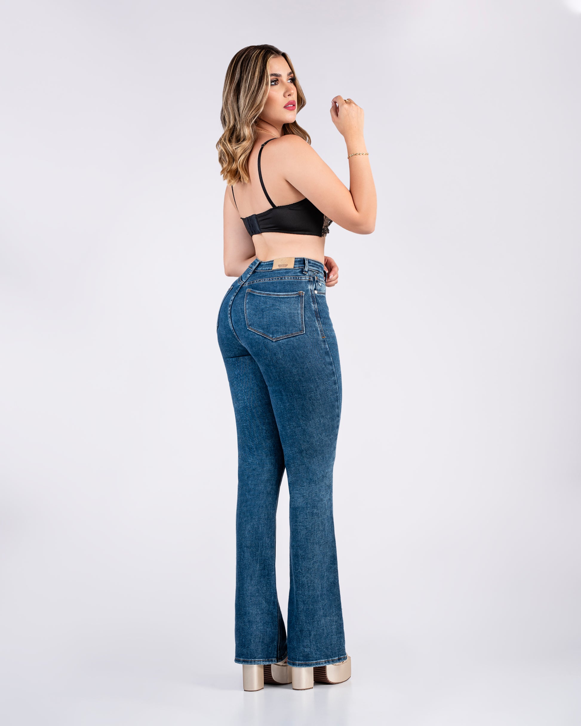 👖🐺Jean Flare fit(acampanado), tiro alto, detalle en pretina, tono azul claro, diseño cinco bolsillos, cintura ajustada, pierna holgada y bota abierta.
